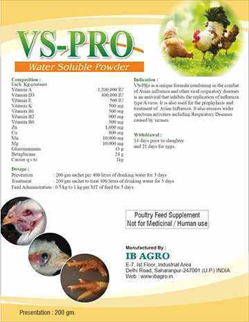 Indications: VS-PRo is a unique formula combining in the combat of Avian influenza and other viral respiratory diseases is an antiviral that inhibits the replication of influenza type A virus. It is also used for the prophylaxis and treatment of Avian Influenza. It also ensures wider spectrum activities including Respiratory Diseases caused by viruses.
